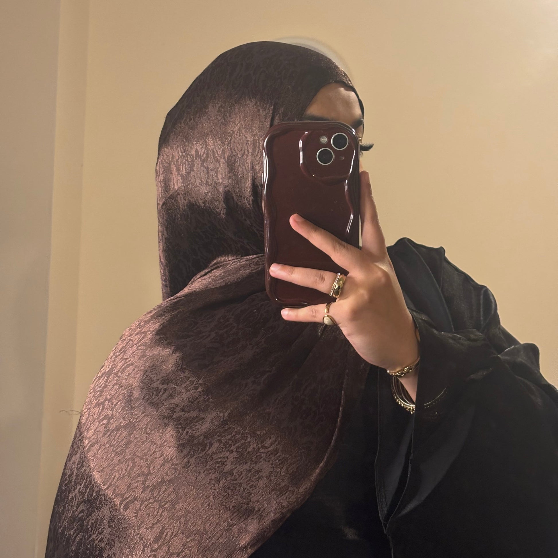 The A I Y R A Hijab is the fusion of luxury and timeless elegance. Crafted from premium jacquard styled Modal/Silk, each piece features a softly textured, woven pattern that catches the light with a subtle, refined sheen. The fabric drapes effortlessly, creating a graceful silhouette that elevates both everyday wear and special occasions.